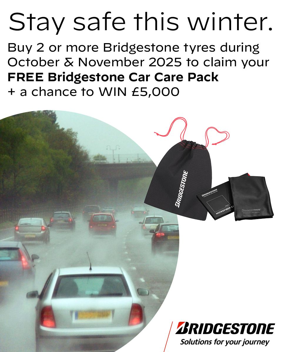 When you buy 2 or more Bridgestone Car, Van or 4×4 tyres in store or online, you’ll receive a FREE Bridgestone Car Care Pack to keep your vehicle winter ready.